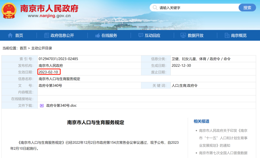 2022年12月30日,南京市人民政府发布了第340号令,文件中明确《南京市人口与生育服务规定》已经2022年12月2日市政府第154次常务会议审议通过,现予公布,自2023年2月10日起施行。