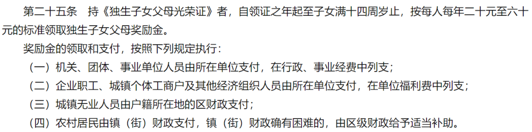 2、持《独生子女父母光荣证》者,自领证之年起至子女满十四周岁止,按每人每年二十元至六十元的标准领取独生子女父母奖励金。