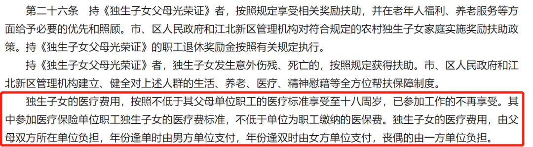3、独生子女的医疗费用,按照不低于其父母单位职工的医疗标准享受至十八周岁,已参加工作的不再享受。
