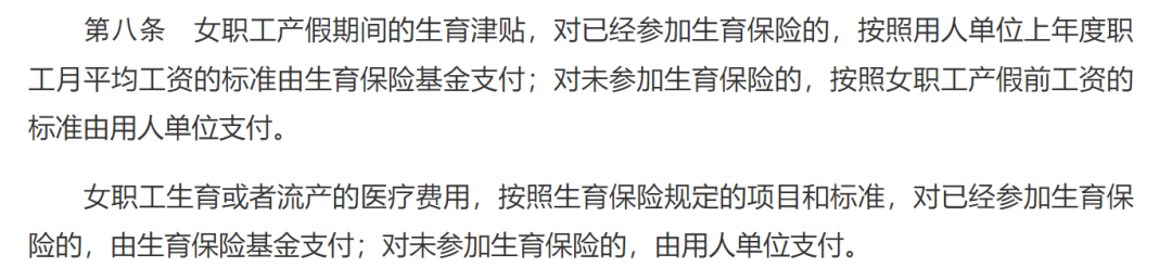 女职工产假期间的生育津贴,对已经参加生育保险的,按照用人单位上年度职工月平均工资的标准由生育保险基金支付;对未参加生育保险的,按照女职工产假前工资的标准由用人单位支付。