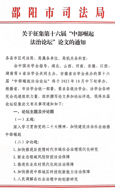 首页>法律知识>法律资讯案例 > 邵阳市律师协会关于征集第十六届“中部崛起法治论坛”论文的通知